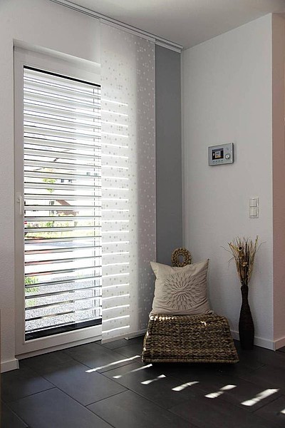 - Laufschiene, Paneelaufnahme- und Paneeloberschiene sowie Endstab können farblich perfekt auf Behang und Raumsituation abgestimmt werden