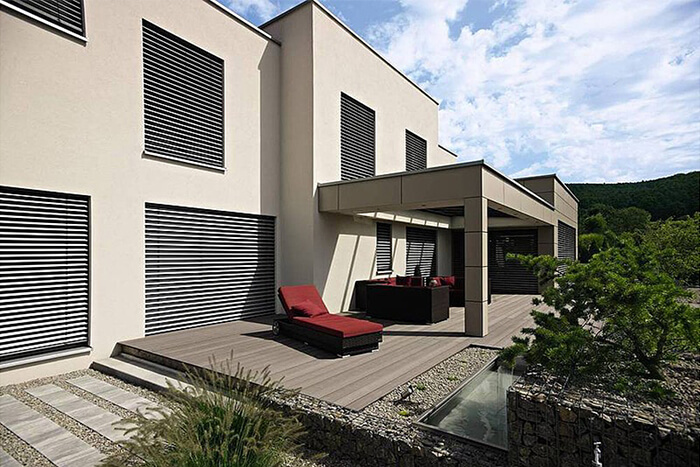 WAREMA Raffstoren zur Außenmontage kombinieren perfekten Sonnenschutz mit aktuellem Design. Sie sind ähnlich konstruiert wie Jalousien, dabei aber viel robuster und auch bei extremen Wetterbedingungen einsetzbar. Ihre breiten Lamellen lassen sich von innen in nahezu jeden beliebigen Winkel bringen und sorgen so zu jeder Tageszeit für wohldosierte Helligkeit im Raum. Zahlreiche Farbvarianten für Lamellen und Führungsschienen machen Raffstoren von WAREMA außerdem zu einem modernen Stilmittel für die kreative Fassadengestaltung.